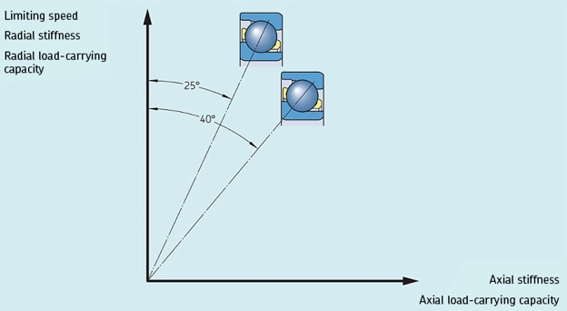 Góc tiếp xúc nhỏ hơn làm giảm khả năng chịu tải dọc trục một chút, nhưng điều này tạo ra những lợi thế khác. Ví dụ, trong các điều kiện nhất định, có thể đạt được tốc độ cao hơn tới 20% so với góc tiếp xúc 40 °. Điều này được hỗ trợ bởi các điều kiện động học thuận lợi hơn trong ổ trục, giúp giảm thiểu thành phần trượt và do đó tạo ra ít nhiệt hơn. Ngoài ra, góc tiếp xúc nhỏ hơn đảm bảo độ cứng hướng tâm lớn hơn, điều này có lợi trong các ứng dụng có tải trọng hướng tâm là chủ yếu.