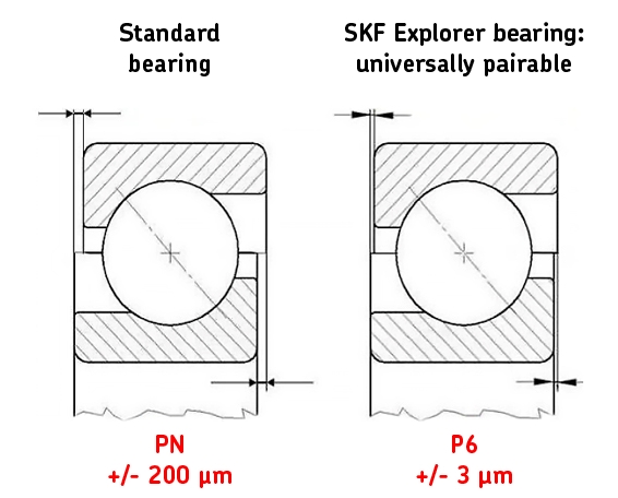 Trước đây, việc sử dụng hai ổ trục đơn 40° giống hệt nhau trong các bộ ổ trục không đối xứng không phải là cách sắp xếp tối ưu. Góc 40° lớn dễ gặp các vấn đề về tải trọng tối thiểu khi không tải. Tuy nhiên, với việc đưa ra dòng sản phẩm mới với góc tiếp xúc 25°, SKF đã giải quyết vấn đề này bằng cách sản xuất các bộ vòng bi không đối xứng kết hợp cả 40° và 25°.