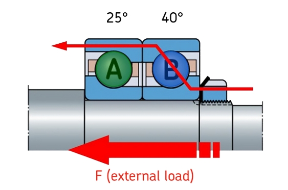 Trong các bộ thông thường gồm hai ổ trục 40°, lực nâng (F1) đạt điểm cao nhất tại một thời điểm, như được biểu diễn bằng nét đứt. Điều này có nghĩa là tải trước được sử dụng hết và đạt gấp khoảng 2,8 lần lực tải trước (Fpreload).