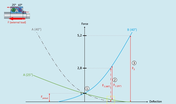 Hệ tọa độ biểu diễn độ võng trên trục x và lực trên trục y. Đường cong màu xanh lá cây cho thấy ổ trục A với góc tiếp xúc 25 ° và đường cong màu xanh cho thấy ổ trục B với góc tiếp xúc 40 °. Vị trí 1 đánh dấu tỷ lệ tải không có tải bên ngoài. Vị trí 2 thể hiện tỷ số tải trọng với lực dọc trục ngoài F1 ở mức lực nâng của gối đỡ 40 °. Vị trí 3 phản ánh tỷ số tải trọng với lực dọc trục ngoài F2 ở mức lực nâng của ổ trục 25 °.